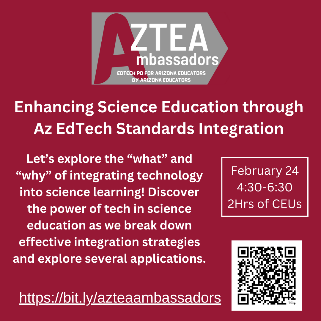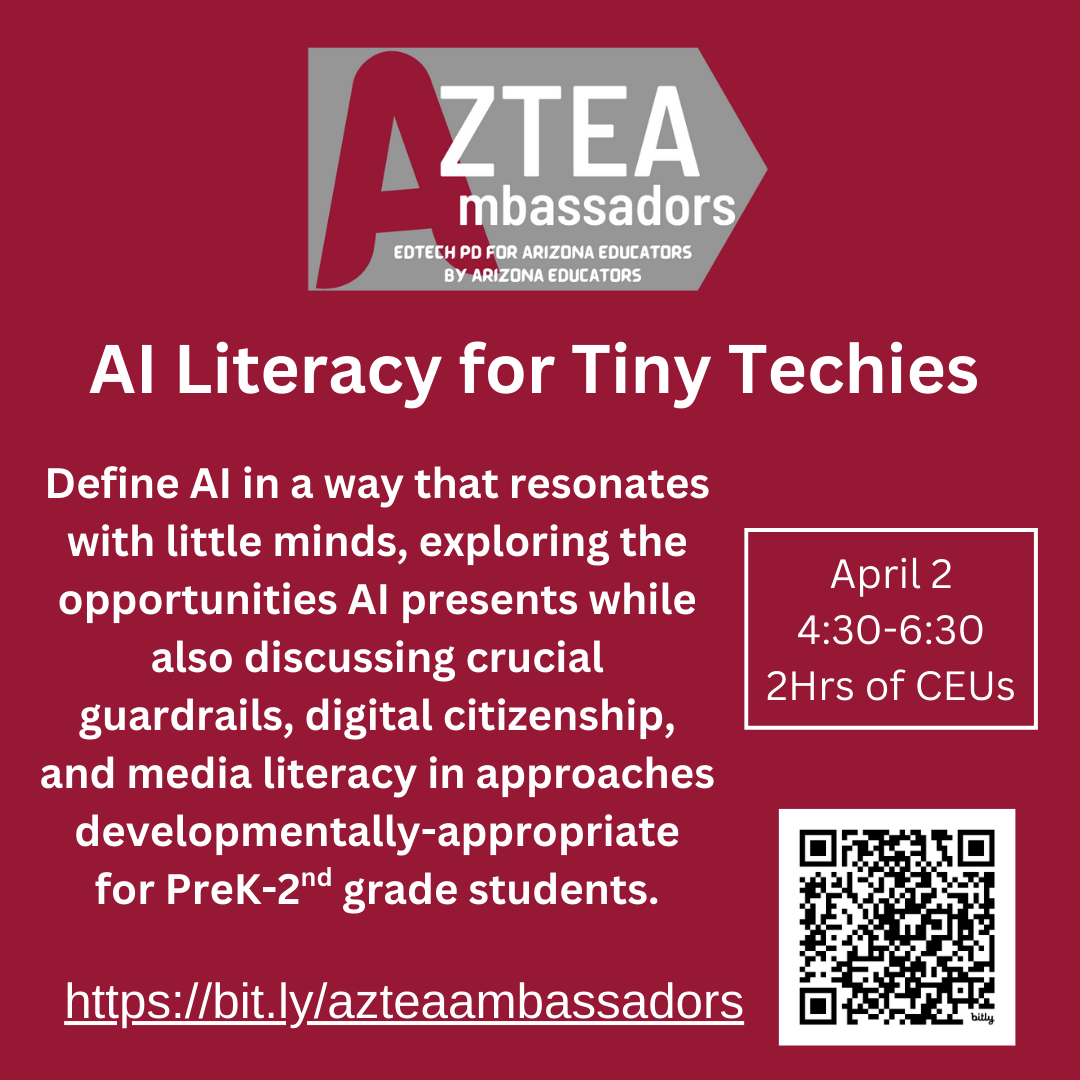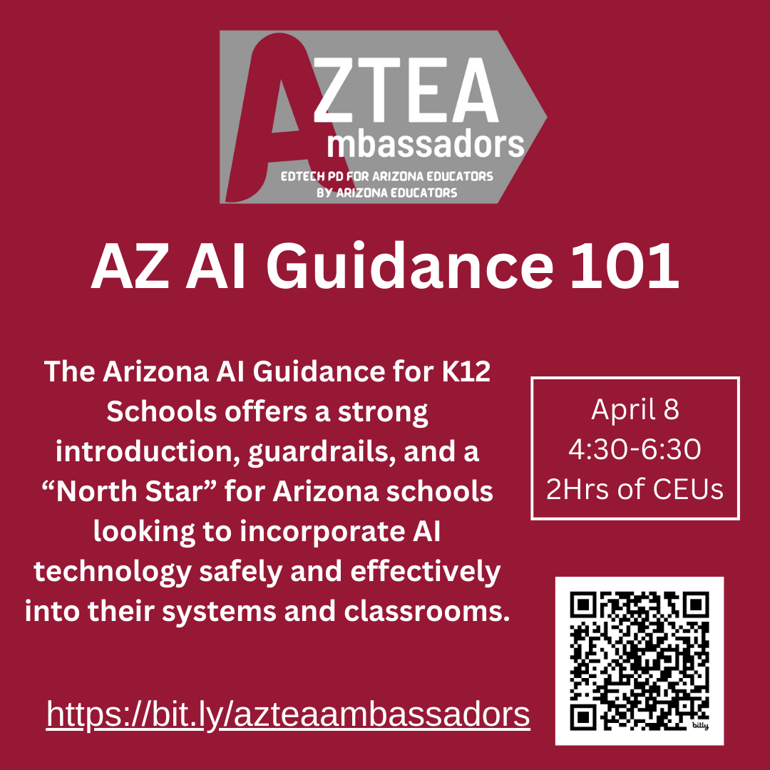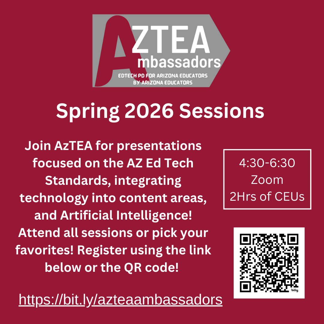 Join AzTEA for a series of presentations focused on the Arizona Ed Tech Standards, Integrating Technology into Content Area Learning, and Artificial Intelligence (AI). Attend all sessions or pick your favorite(s).