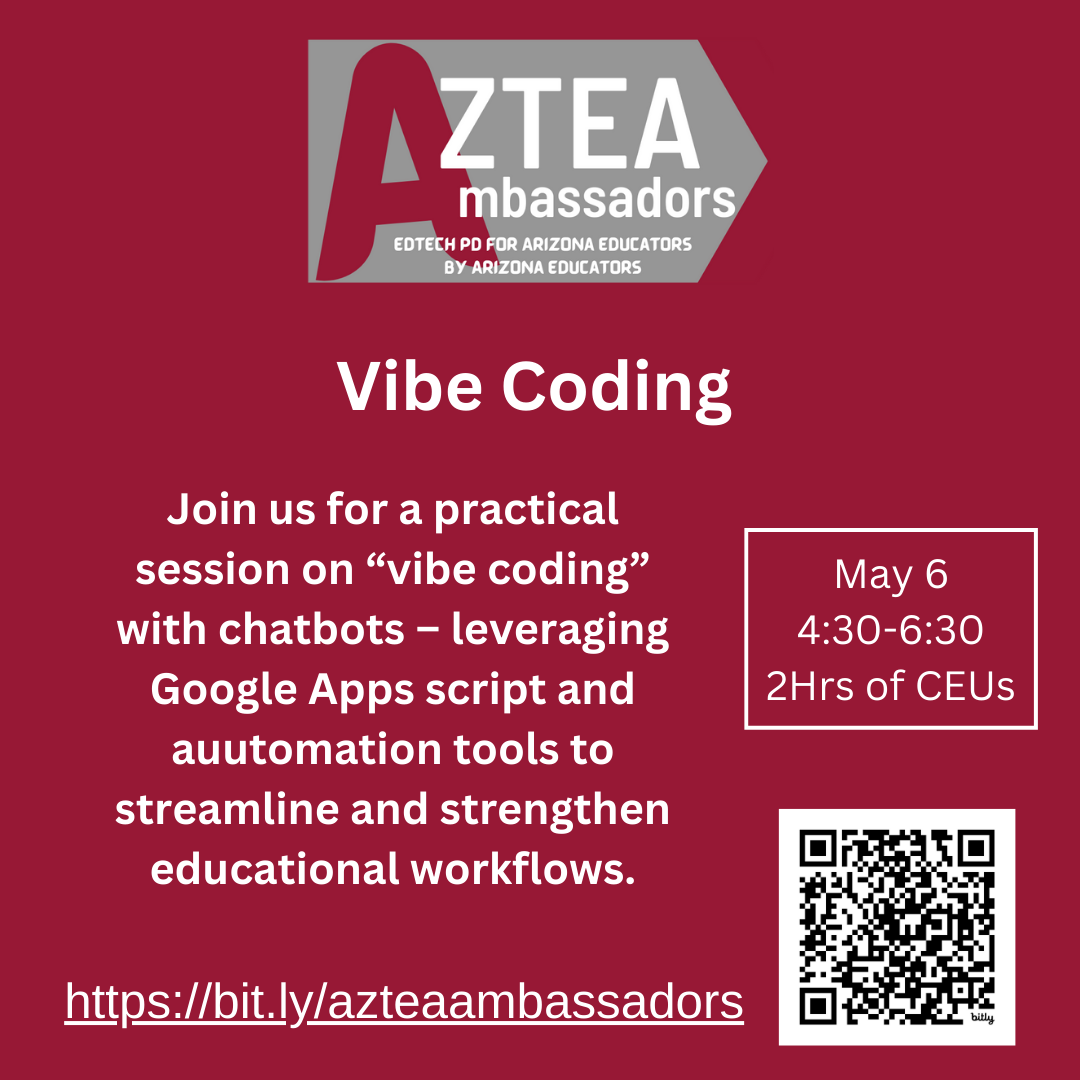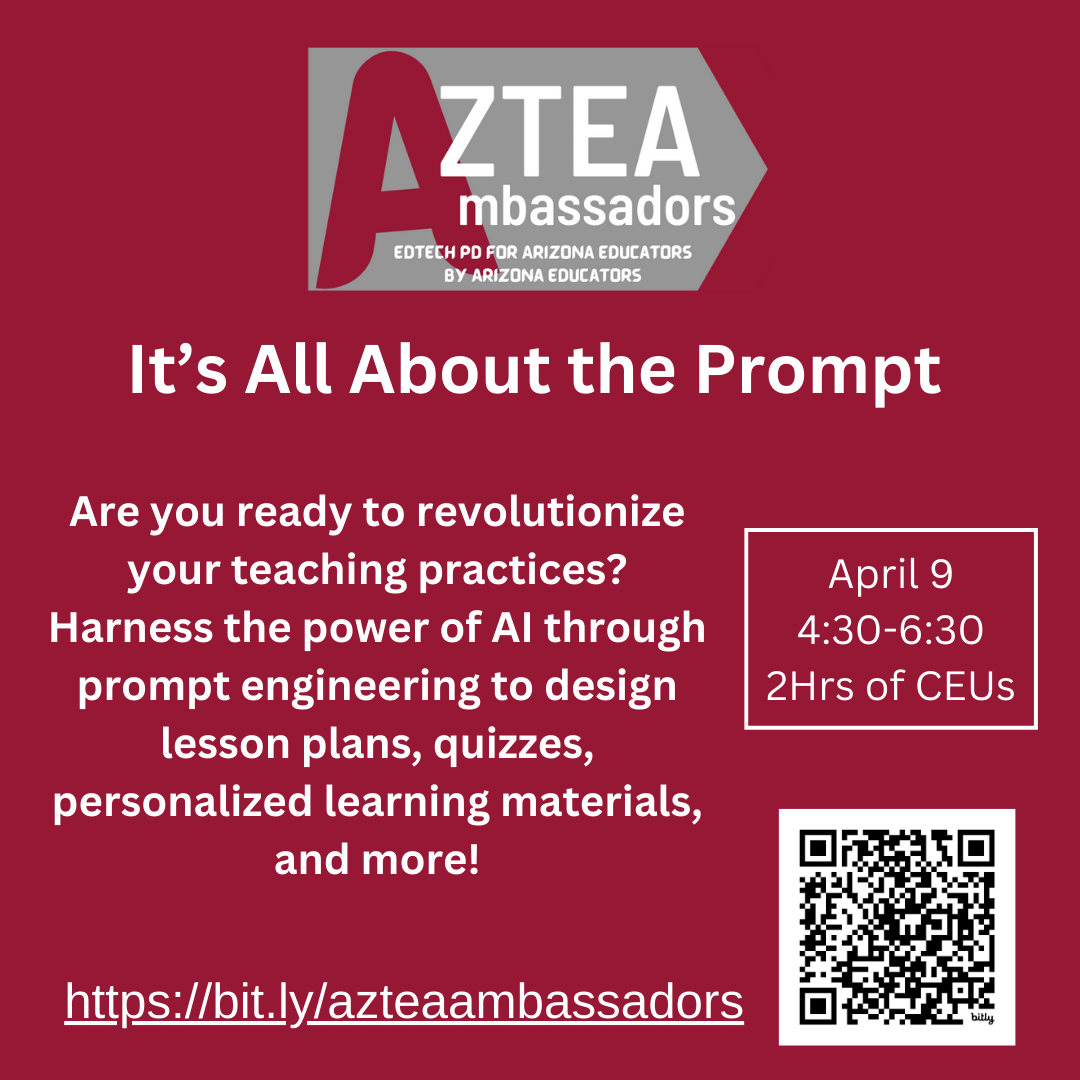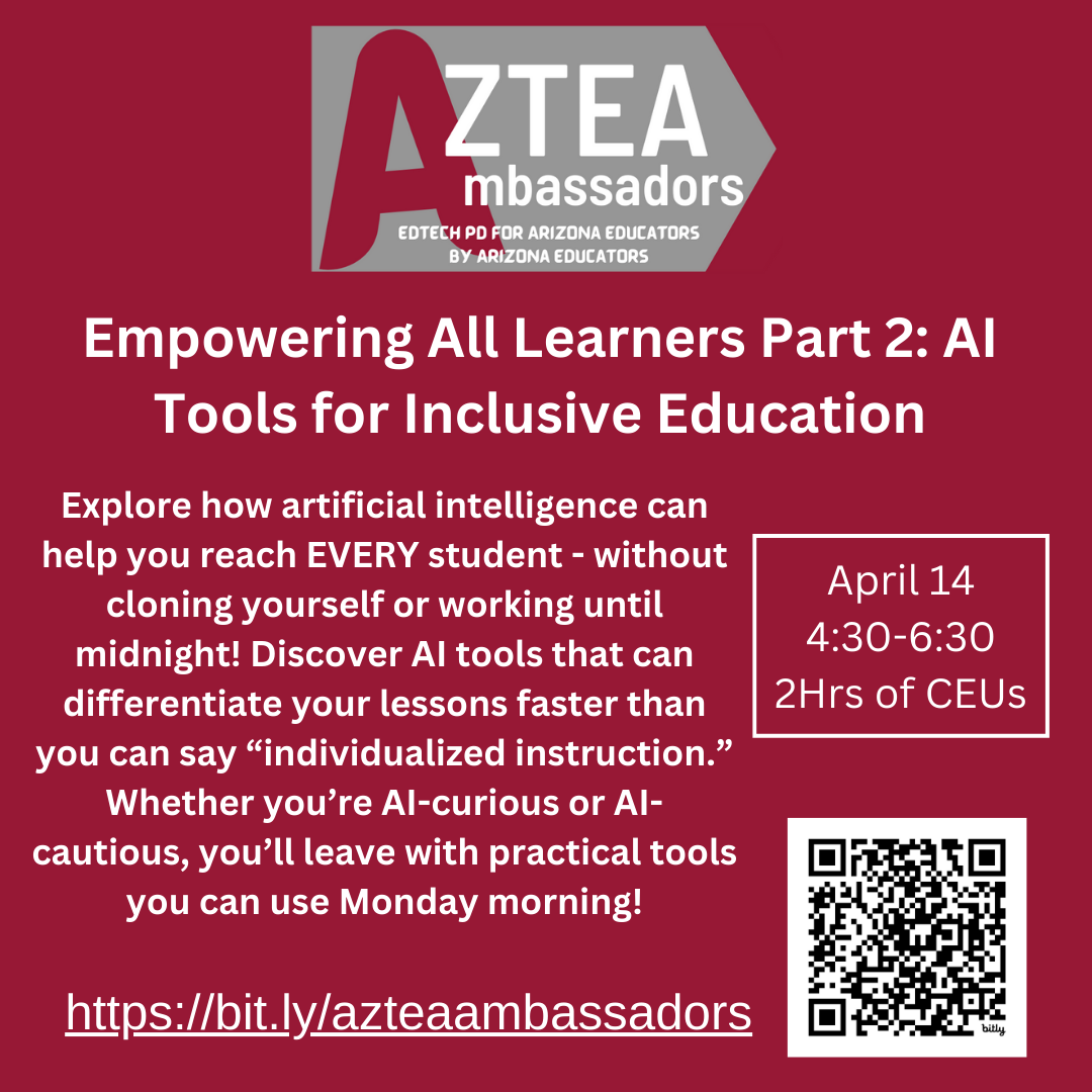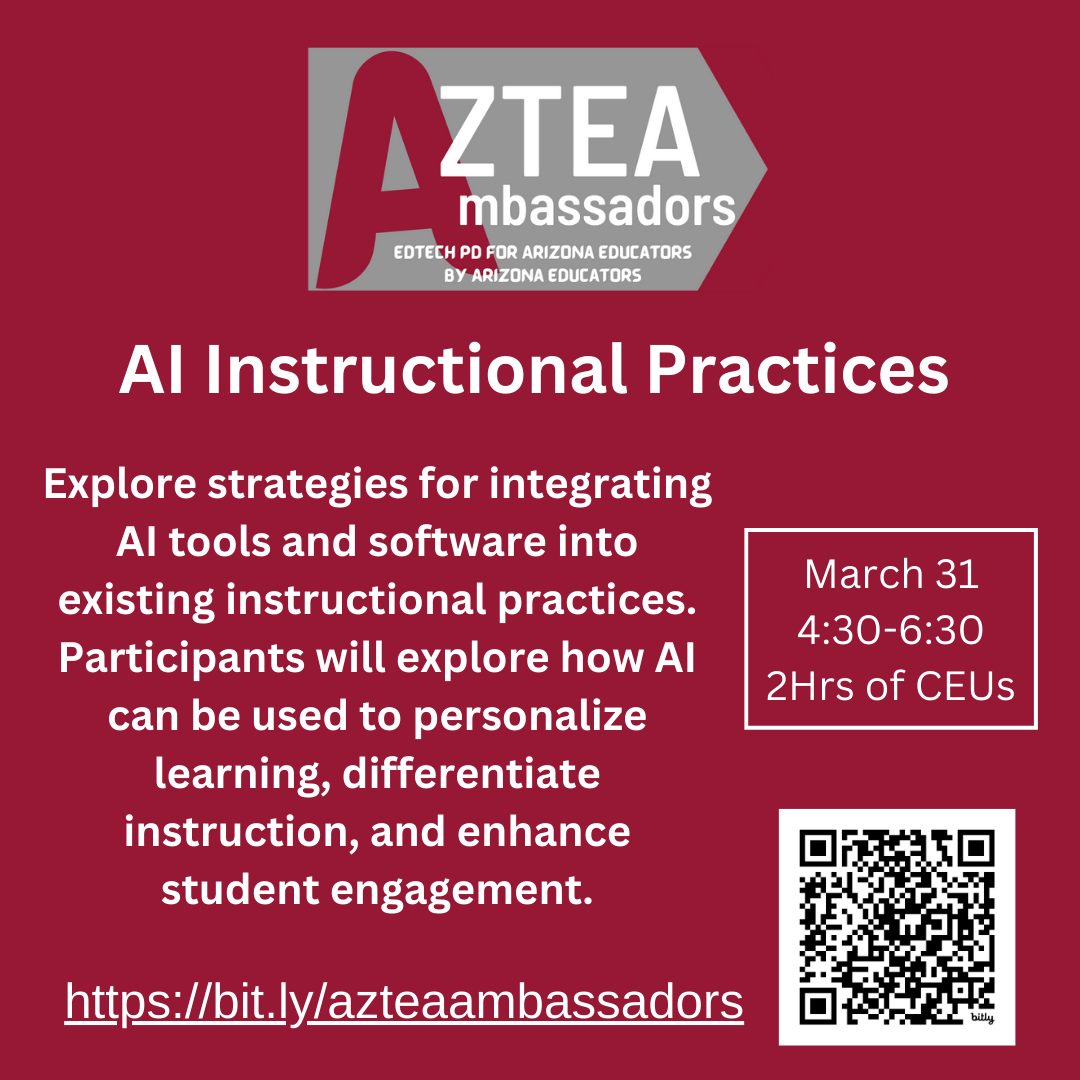 Join AzTEA for a series of presentations focused on the Arizona Ed Tech Standards, Integrating Technology into Content Area Learning, and Artificial Intelligence (AI). Attend all sessions or pick your favorite(s).