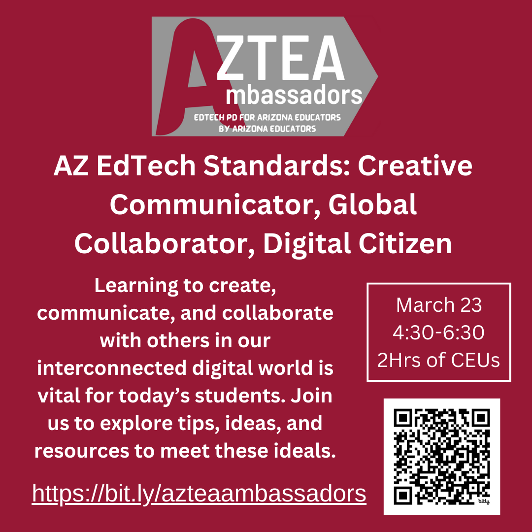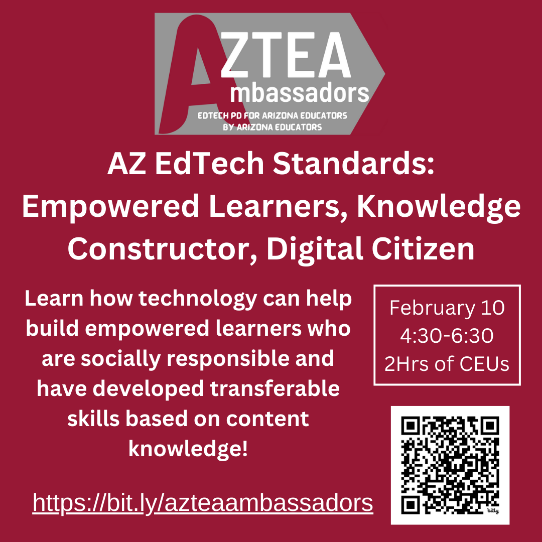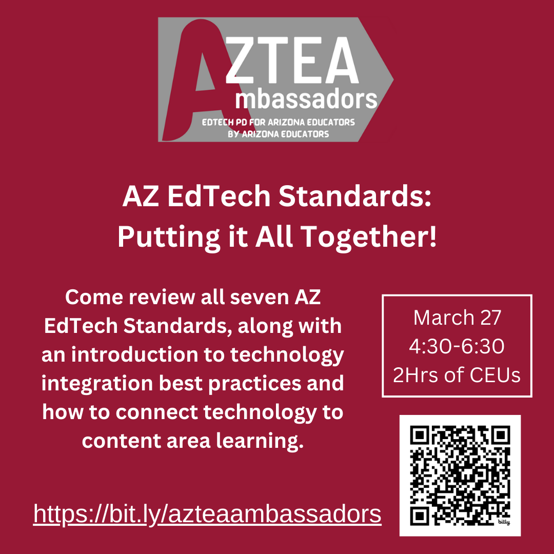 Are you looking to integrate technology effectively to enhance learning, empower students, and increase creativity? AzTEA (Arizona Technology in Education Association) with the support of the Arizona Department of Education is providing professional learning opportunities focused on learning with technology using the newly adopted Arizona Educational Technology Standards.