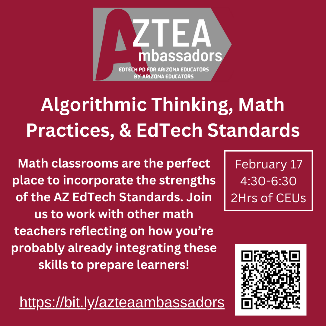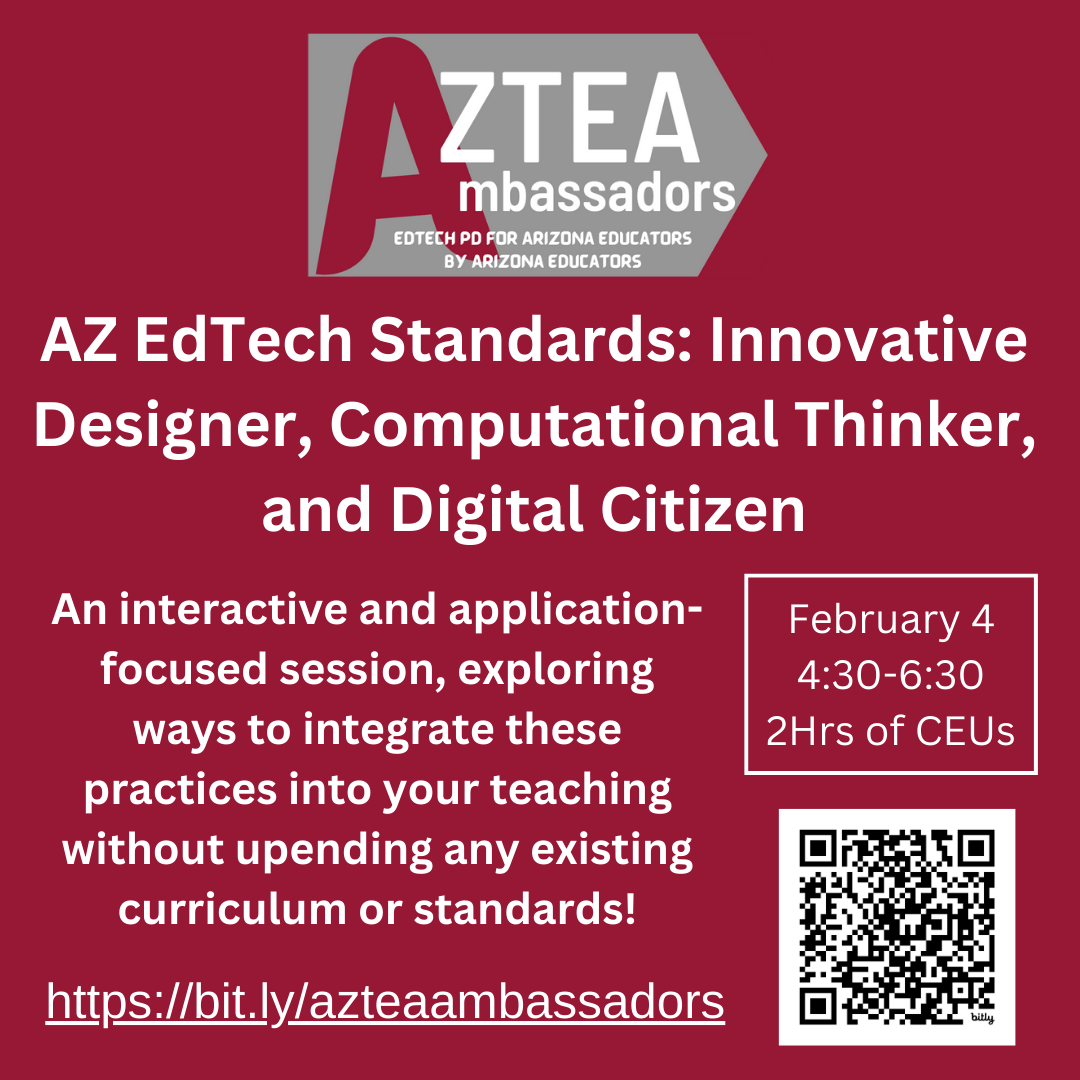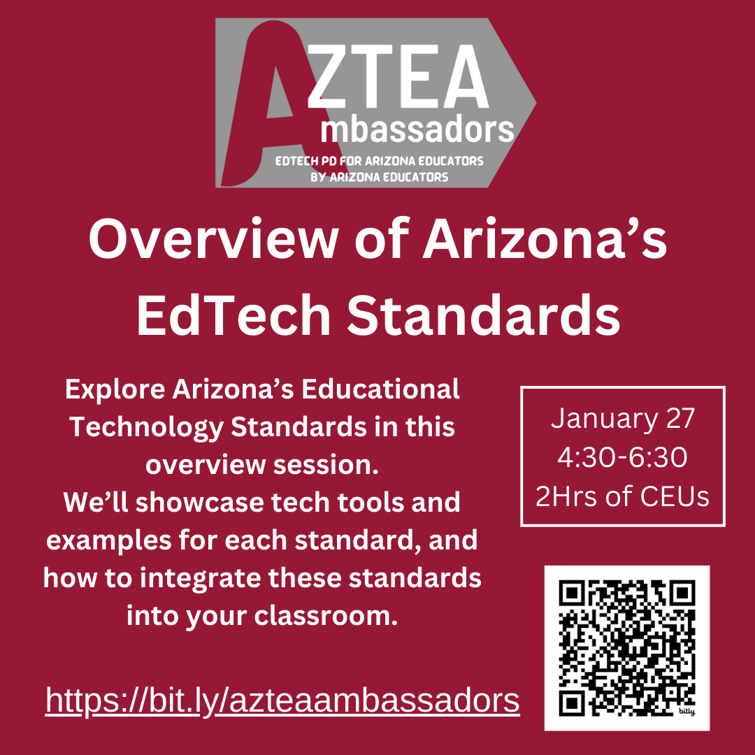 Are you looking to integrate technology effectively to enhance learning, empower students, and increase creativity? AzTEA (Arizona Technology in Education Association) with the support of the Arizona Department of Education is providing professional learning opportunities focused on learning with technology using the newly adopted Arizona Educational Technology Standards.